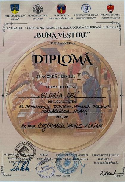 Succesul a continuat și la secțiunea corurilor mixte, unde Corul „Gloria Dei”, dirijat cu măiestrie de pr. prof. Adrian Cojocariu, a oferit o prestație de înaltă ținută artistică. Vocile armonios împletite ale tinerilor au adus în palmaresul instituției un binemeritat Premiul al II-lea.
